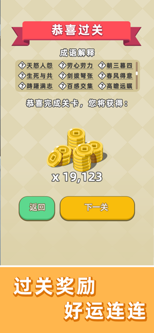 3、大量的成语闯关内容,在游戏里玩家可以任性发挥自己的成语储备量,欢乐过瘾尝试顺畅通关