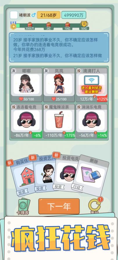 花钱模拟器游戏破解版2022非常逼真得意一个花钱模拟游戏,十分简单的游戏玩法,花钱如流水的游戏真是体验,好玩的模拟功能,游戏里面的玩法还是很有趣味的,赶快来游戏里面一起模拟体验一下吧,这里的功能齐全,给大家不错的游戏享受哦!