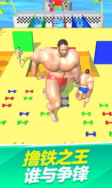 收集哑铃的过程中,玩家需要一边收集与自己颜色相同的哑铃,一边躲避身材强壮的竞争对手。毕竟,被撞击之后会损失掉所有收集的哑铃。
