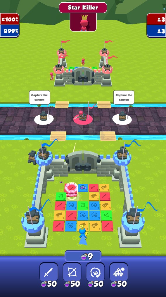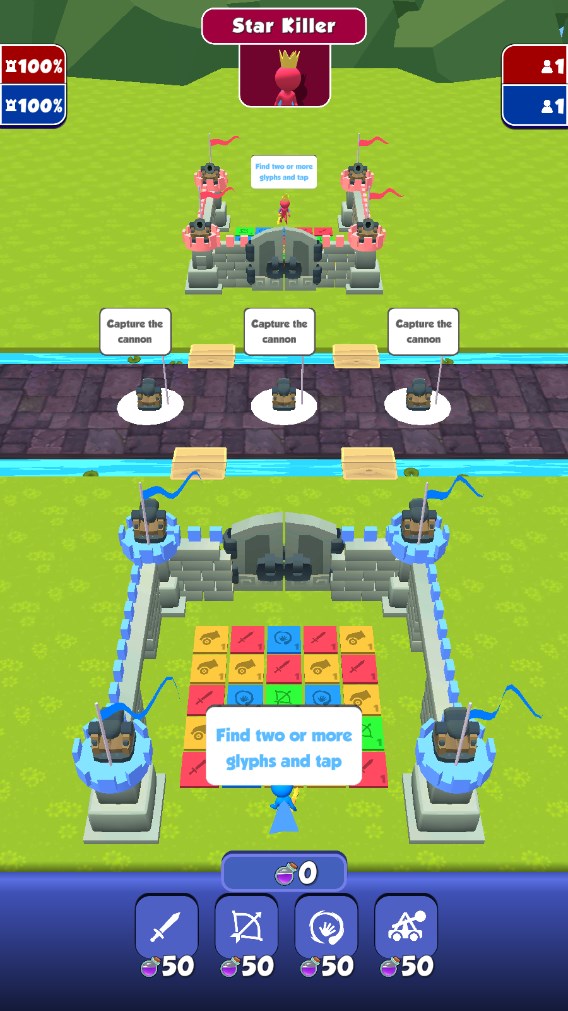 城堡对抗赛游戏是一款合成玩法的策略战争游戏。这是一场发生在两个城堡之间的战斗,我们将会作为指挥官进行战斗指挥,通过合成不同的指令来进行攻击,不同颜色的方块代表不同的战争武器,通过合成召唤战争武器,用更多同相同元素召唤出战争武器的时候,攻击力以及防御力也会更高哦!这样也更加容易获胜!