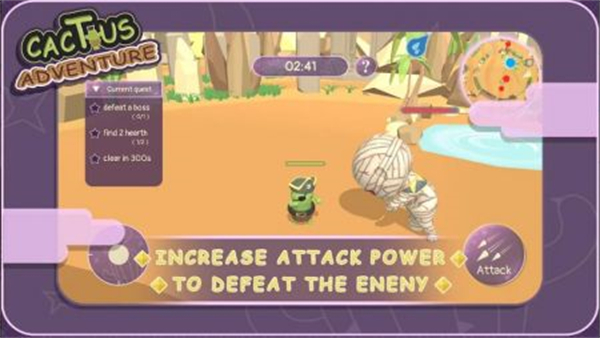 仙人掌历险记作为一款趣味模拟冒险小游戏,在游戏里玩家将会化身成为一个小仙人掌,小仙人掌还拥有不同萌萌可爱的造型可以更换,在游戏里玩家将会操作仙人掌进入到沙漠的世界,在全3D打造的游戏当中尽情寻找隐藏的乐趣,在游戏里面会遭遇许许多多特别的精彩故事,在游戏里玩家可以根据自己的兴趣选择适合自己的游玩模式。