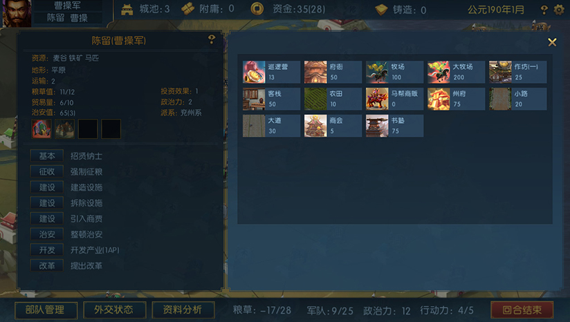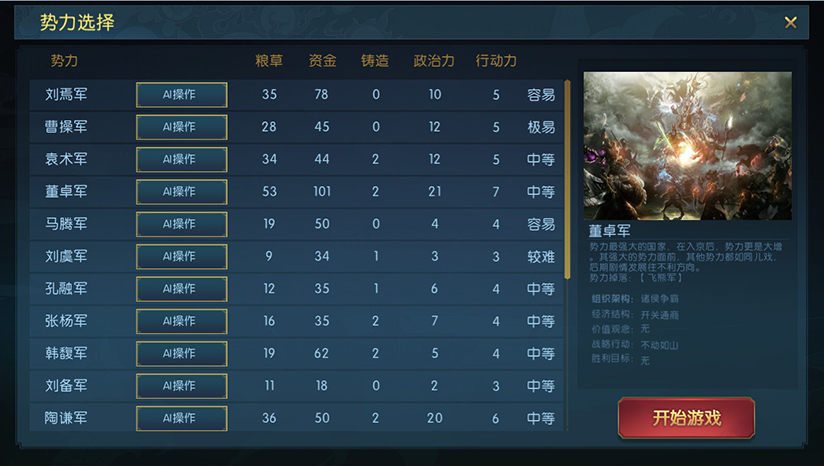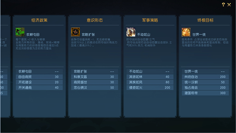 不同势力占据不同的地理位置,根据当地经济形态特点,玩家可选择农耕、贸易、采矿、放牧等方式作为主要的经济发展模式。游戏模拟三国时期各地物品产物,增加多样化的战争资源,如骑兵需求马匹产出。通过提出经济政策,优化势力改革,大大增强势力的经济实力,也可以通过恶性倾销打击敌对势力。