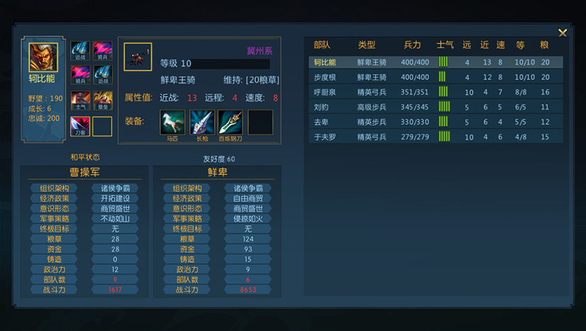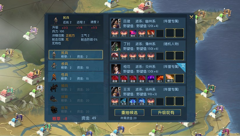 游戏集结三国三千将领,全面覆盖三国时期的名将良臣。部队分为步兵、骑兵、弓兵三大类,侧重领域不同,属性加成也会随之改变。一方面,玩家可以对征召的武将进行训练升级、扩编部队,另一方面,征召的部队都有不同的技能,合理的技能组合往往能带来不可思议的效果。