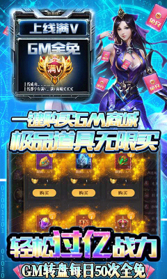 3.一键获得满级GM,新用户上号即可获得满级v,轻松购买gm商城,极品道具无限制购买,战力轻松过亿。