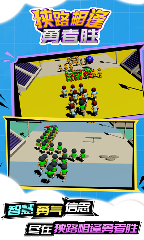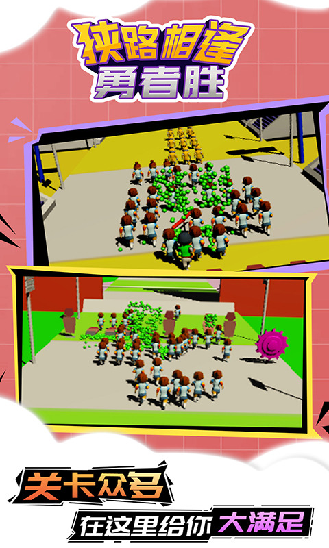 狭路相逢勇者胜作为一款充满刺激感竞技类型的手游。狭路相逢勇者胜游戏中,会有许多的用户一起来到这个赛道上面,前面的障碍物也是众多,跑在最前面也不一定能获得胜利,只有到达终点才算胜利,所以不用急着抢第一,看着局势进行安排。