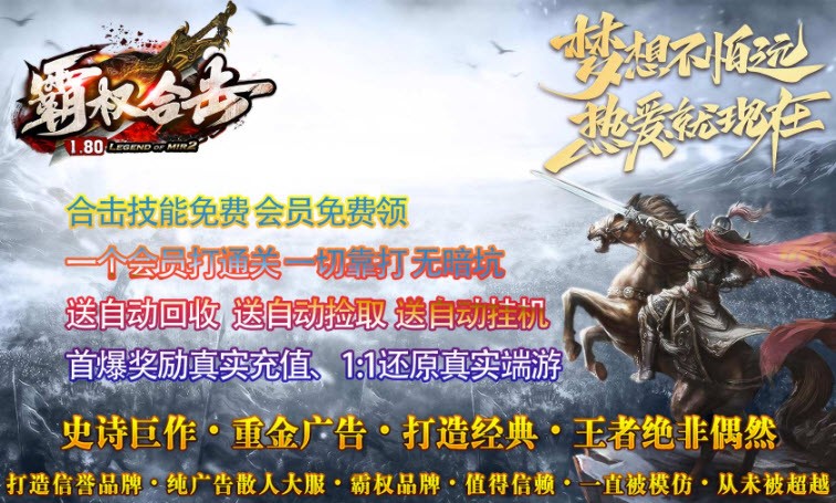 霸权合击,1.80合击版传奇,上线就送合击技能,伤害爆炸。霸权合击,多种合击方式可选,操作你的角色在这个开放的大陆上尽情的闯荡冒险吧。你会收获许多,认识更多的兄弟。
