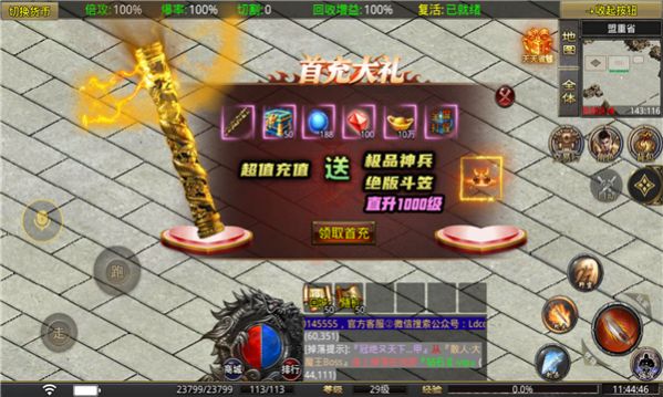 2、首充玩家:赠送全屏吸怪打怪,直接进二大陆,免去半小时升级时间,力压白嫖一步。