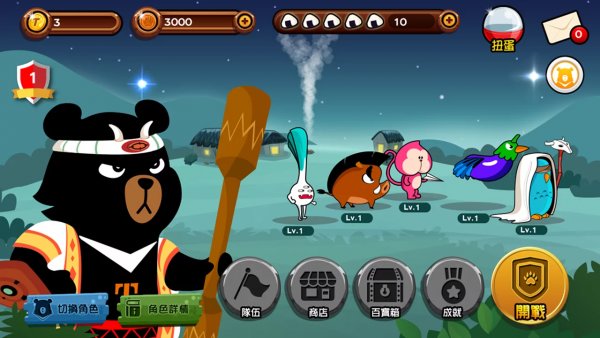 熊熊谷防卫战正版游戏将台湾特有物种及各地农特产融入到角色设计中,例如代表宜兰三星葱的“冲冲葱”、以鲁凯族图腾为造型的“百步穿羊”以及象征桃园拉拉山水蜜桃的“蜜桃猴”等有趣的角色均会在游戏中登场,并且在游戏的初始状态下,喔熊就会陆续拥有这三个小伙伴。