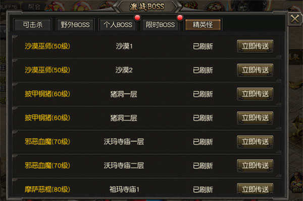 祖玛教主、魔龙教主、赤月恶魔等等,还原传奇中boss的经典造型和攻击方式,击败boss掉落大量珍稀的道具和装备,记忆中的场景再度出现,散落各地的勇士们拿起武器,再次集结拯救世界!