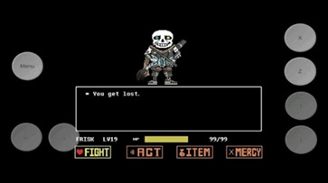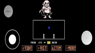 5. 战斗方框:如果敌人选择攻击你(不论你是否选择主动攻击),在屏幕下方会出现一个方框,玩家操控这个心形对方框的图案进行躲避,一旦被触碰就会受到伤害,某类特殊图案即便是触碰了也不会受到伤害(如骷髅的蓝光)。
