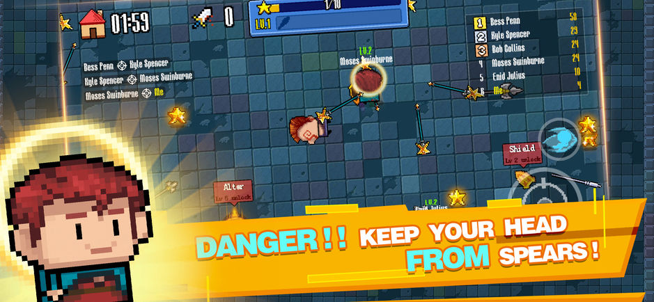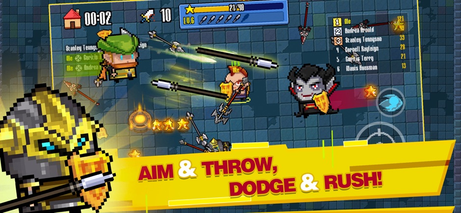 一款像素小人拿着标枪进行对战的游戏。这款游戏的画风是采用的经典而又不朽的像素风格,玩家能够控制着这些像素小人,在场地之中进行对战。多样的不同的人物,都是这游戏之中独特的存在,而人物感觉有点像中世纪骑士。