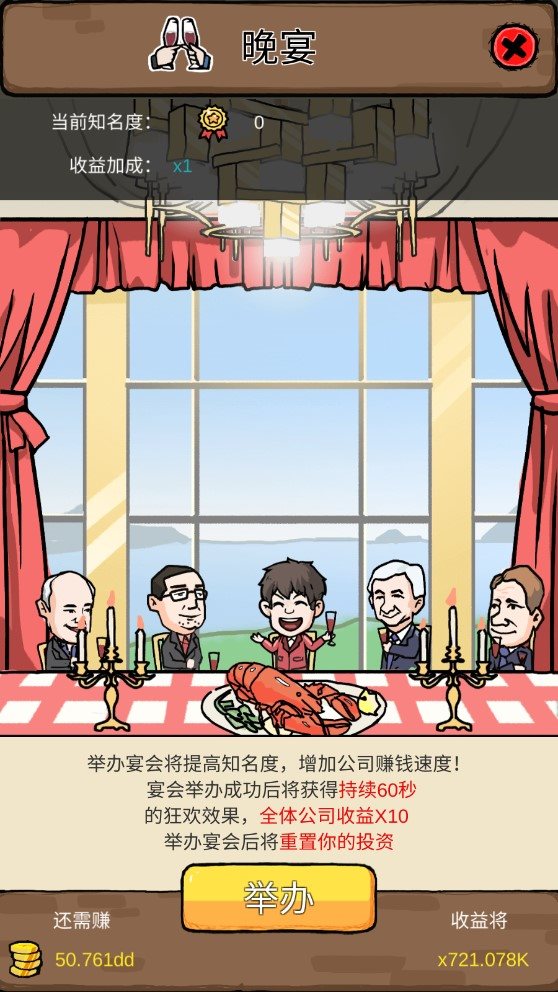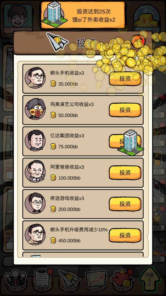 富豪挂个机这个模拟类型的经济手游,使玩家朋友们可以带给你享受这个挂机型的挂机游戏所带给你的乐趣体验,让你可以尽情的畅玩这个有趣的经营类型的游戏所带给你的乐趣体验,喜欢的朋友们快来看看吧!