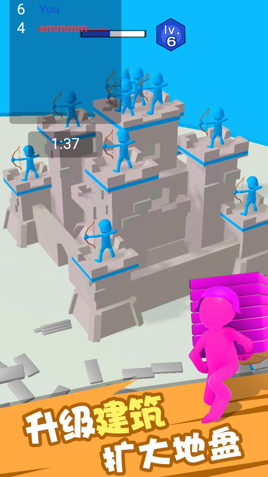 1、用户控制人物在地图上不断的收集砖块来升级的自己的城堡,应对危机。