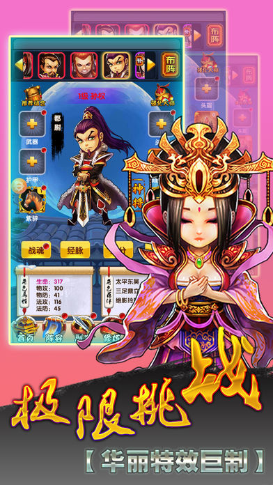 随时都可以发挥自己的能力,参与到这场极限的挑战环节当中,让你玩的更加尽兴,也可以在游戏里面决战新的篇章,带给你别样的三国挑战,有着非常多的激情游玩场景,把所有的卡牌全部都收集在一起,形成自己的强大阵容,不管是装备阵型还是策略玩法,都可以给玩家呈现出更加用心的搭配过程,发挥出自己的超级智商能力,把所有的敌人全部都打败,游戏里面的关卡可是非常的多,你可以随时参与其中。