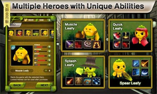 2、具备独特能力的多个英雄可通过战斗获取绿叶,购买一系列英雄角色。