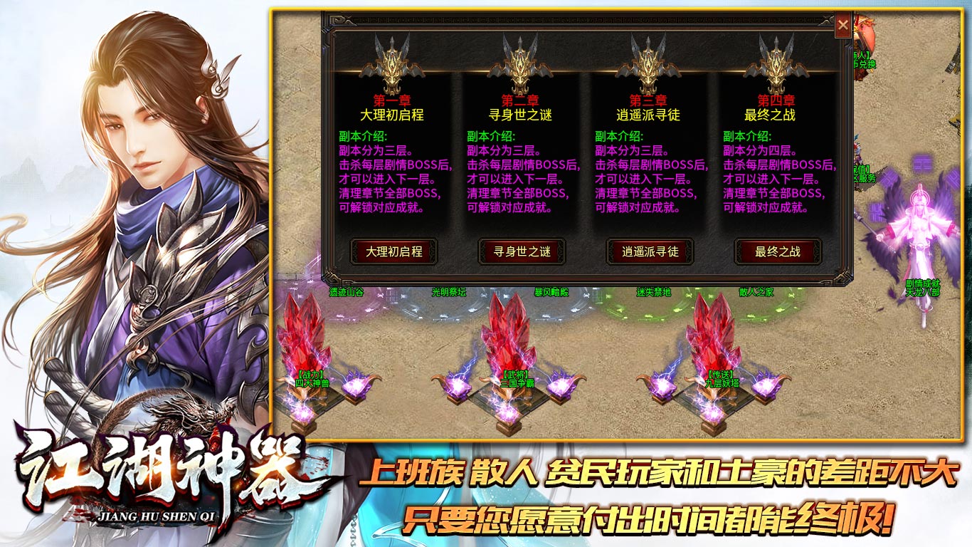 八五七江湖神器手游是一款只要玩家愿意付出时间就能够成为游戏内的超级大神的热血传奇手游。在这款游戏中,对玩家提升战力非常重要的各种极品装备全都需要依靠打怪刷怪来获取,而且装备还能支持进行自由交易,账号的保值程度也非常的高。
