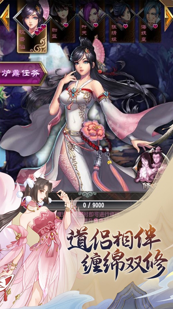 1、唯美仙境,自由探索,随意挑选众多修行角色;