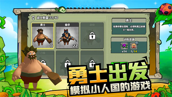 3、同时还提供了战士训练项目,在游戏中你可以训练勇士、猎手、游侠,或者刀客、天兵来提升小人国的战力。