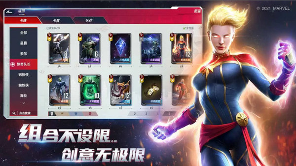 除了画面效果炸裂之外,游戏内的卡组也相当的丰富,玩家们可以随意将漫威英雄卡牌组合成不同的卡组模式用于战斗和清除障碍,即使是大反派海拉也能和正义代表钢铁侠组成卡组,不受局限。