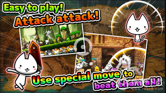 对任何人来说都很容易玩!超级可爱的猫和超简单的RPG!当然,游戏怪物和儿童也是受欢迎的!拍拍你的角色!他们有时会表现出他们的特殊动作!进攻是最好的防守!猫继续前进!