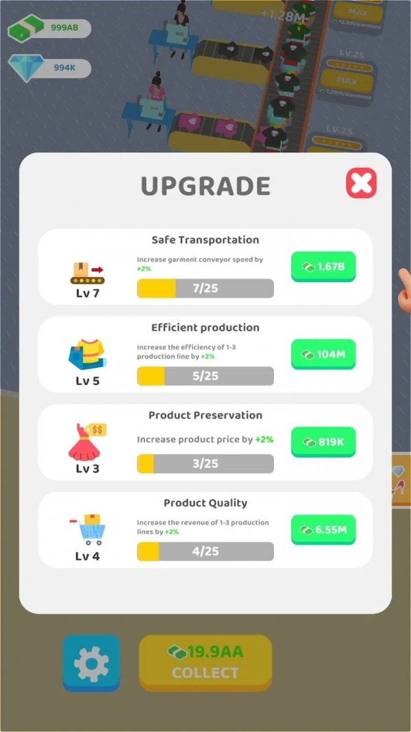 衣服工厂大亨,衣服剪裁制作游戏。玩家将加入这个衣服剪裁队伍,召集更多员工,收集你的道具,升级装备,提高效率,完成衣服订单吧。