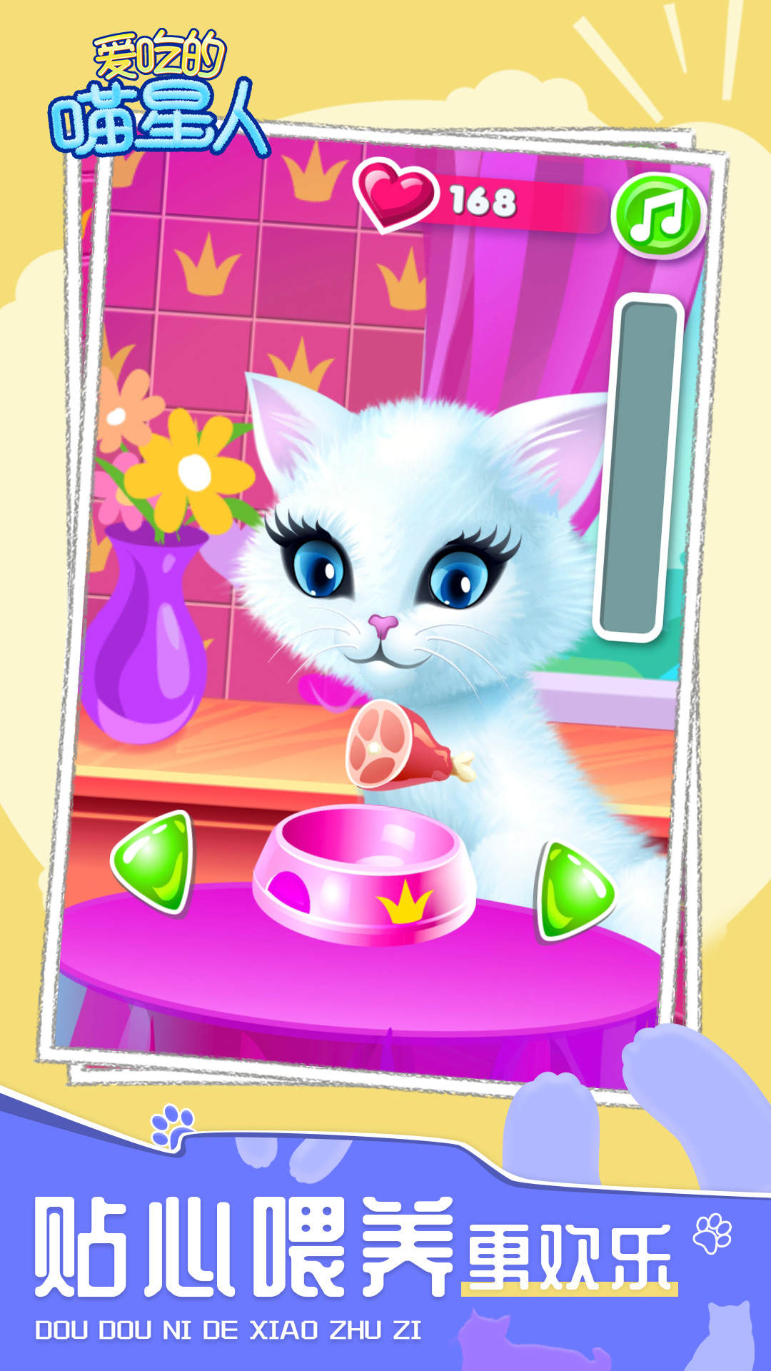 爱吃的喵星人作为一款休闲益智游戏,在游戏里面有一个可爱的小猫,它全身都是白色的,同时还会带着一个粉色的蝴蝶结,我们要带着它一起去和各种人抢食物。食物的种类是比较繁多的,有肉制品,蔬菜水果以及各种甜点,把这些食品送到自己的小猫身边,让它一起吃的更肥。