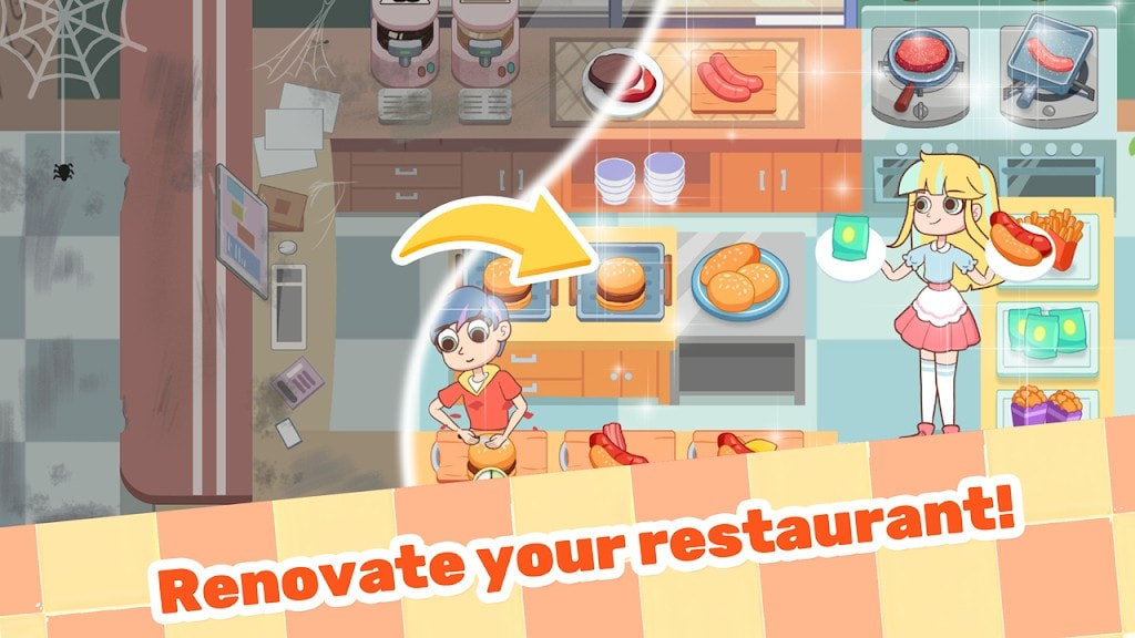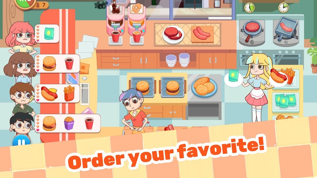 通过经营店铺赚取金币,游戏有新菜品制作,外卖接单,管理员工等趣味玩法