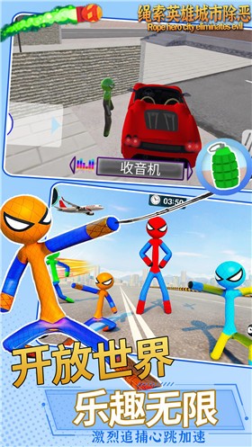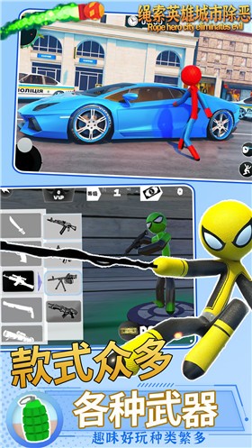 绳索英雄城市除恶是一款英雄动作冒险游戏,在一个充满危险的奇幻世界中,玩家可以选择不同的角色来探索世界,完成各种任务。玩家可以升级和装备自己的角色,提高战斗能力。高质量的图像并不酷,很简单,没有特效,但很刺激。