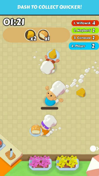 玩家需要控制厨师在大地图上寻找食材,进行简单的加工,并完成订单要求。与传统的IO玩法不一样,更重视在完成过程中的竞争。玩家不用担心自己辛辛苦苦的成果被完全夺取,只要专心完成自己的厨房任务,并阻止其他玩家完成即可。整体风格非常卡通可爱,适合所有的玩家,节奏快速,每局游戏不超过5分钟。
