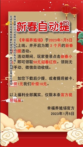 幸福养殖场是一款养殖赚红包的小游戏,从基础建设抓起,不断的精心照料你的农场,合理使用各种道具,帮助你的动物们健康成长,出售各式各样的产品,获取收益奖励,游戏的操作很简单!