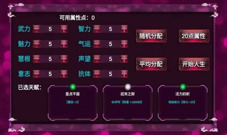 开局之前可以选择好天赋,之后便是分配属性,这会决定玩家的身份,以及未来的遭遇,非常的魔性哦。