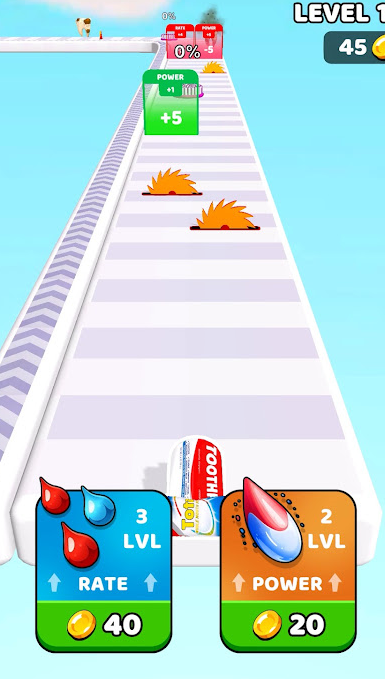 牙膏冲刺跑游戏是跑酷类型的,能使玩家在关卡中作出不同的选择,从而保障有足够数量的牙膏,在游戏的终点能看到破损的牙齿,只要达到任务目标就能获得金币奖励,要保障牙膏拥有充足的数量,这样才能清洁更多的牙齿,在游戏里面是无法控制牙膏行动速度的,所以考验用户的应对能力。