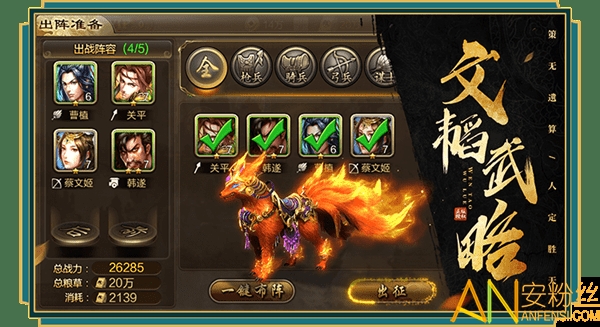 100多个知名武将!几十个兵种与单独匹配的战术!十几个九宫格搭配阵型!有偏重攻击的,有专攻防御的,有增加怒气和血量的!游戏当中的策略战斗系统可以让玩家充分发挥自己的排兵布阵能力,巧妙利用阵形、兵种、战法来达到最大化地发挥武将的战斗实力!更有独有的“武缘”技能点亮系统使武将与武将之间产生战斗羁绊,从而在战争推图和实力角逐中发挥巨大威力!