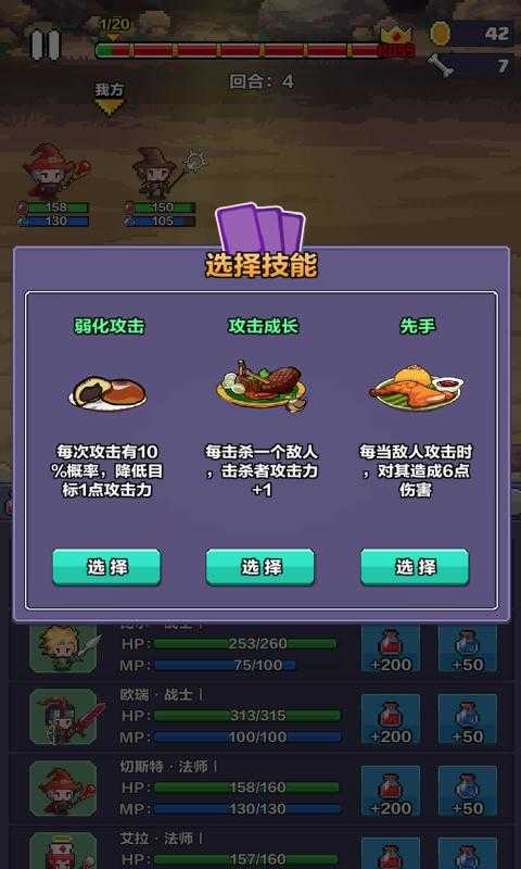 3、游戏中每打败一关敌人,可从3个随机技能选择一个装备。