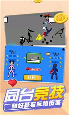火柴人混战中,玩家需要选择自己喜欢的火柴人角色进入游戏,接受各种挑战和任务。玩家可以使用不同的武器和技能,如近战武器、远程武器、爆炸物等来攻击敌人。火柴人混战手机版中的关卡和模式非常多样化,从简单的教学关卡到复杂的PvP竞技场,还有各种BOSS战等待玩家挑战。