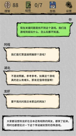 8夏夜怪奇物语真实恐怖游戏,一个文字类的恐怖游戏,在夏夜怪奇物语真实恐怖游戏里有很多对话要你选择,玩家将根据选择不同的对话来体验不同的结局,每一个恐怖故事都有很多种结局,不断做出选择来体验全新的乐趣吧。