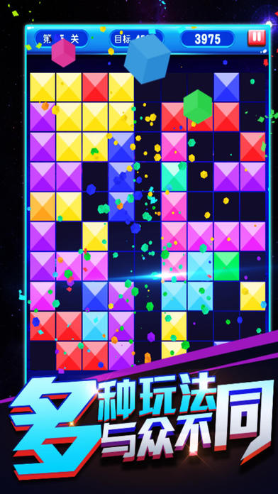 在经典模式中,消除的方块非常简单。点击相邻的同色方块就能够完成一次消除。一次消除的越多获得的积分就会越多。当积分达到关卡要求后,就能够进入下一个关卡,同时刷新棋盘。而当整个棋