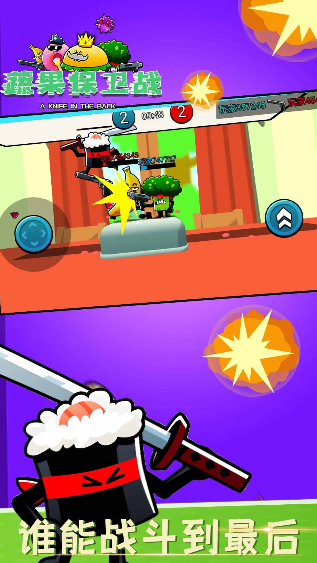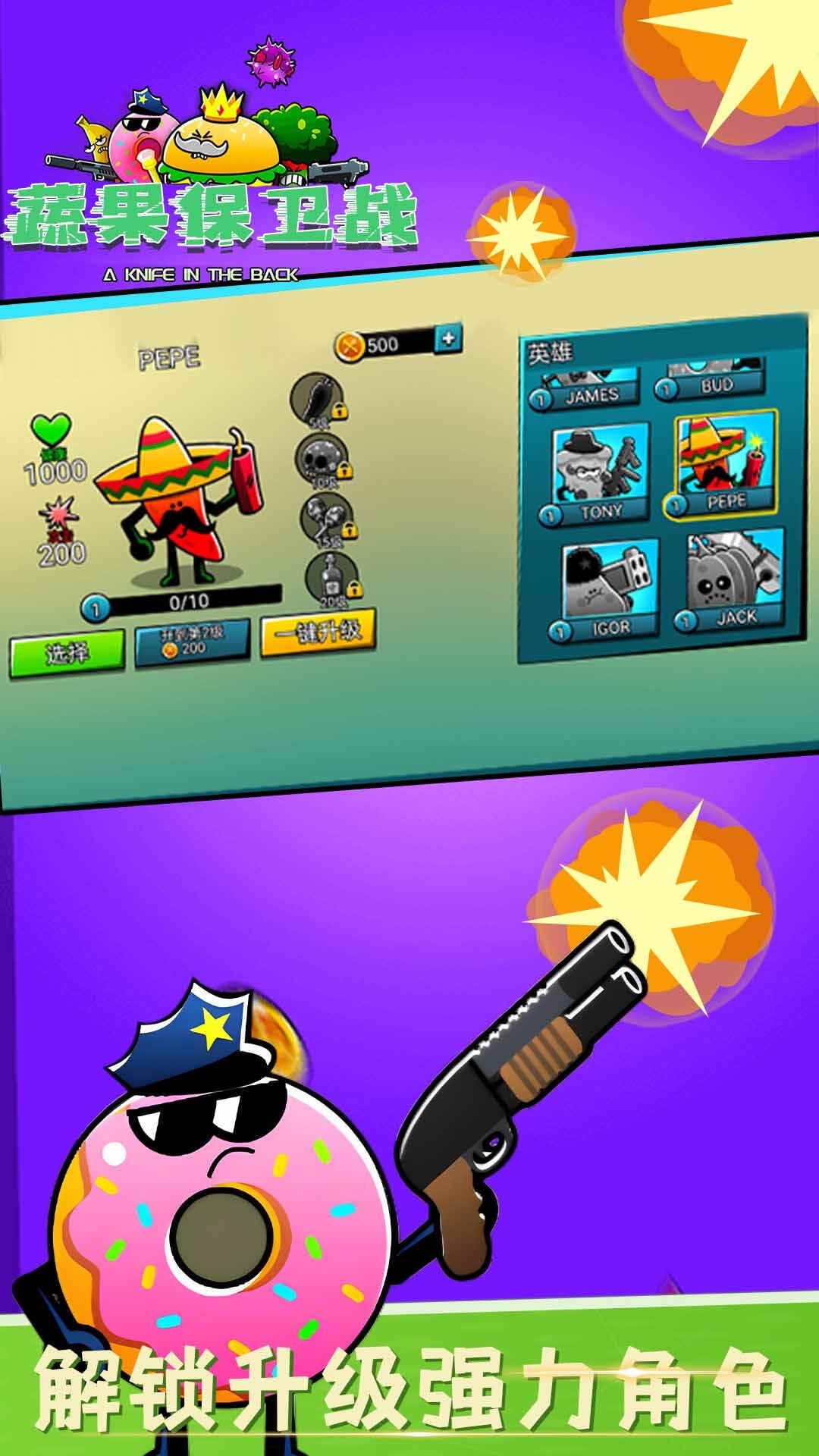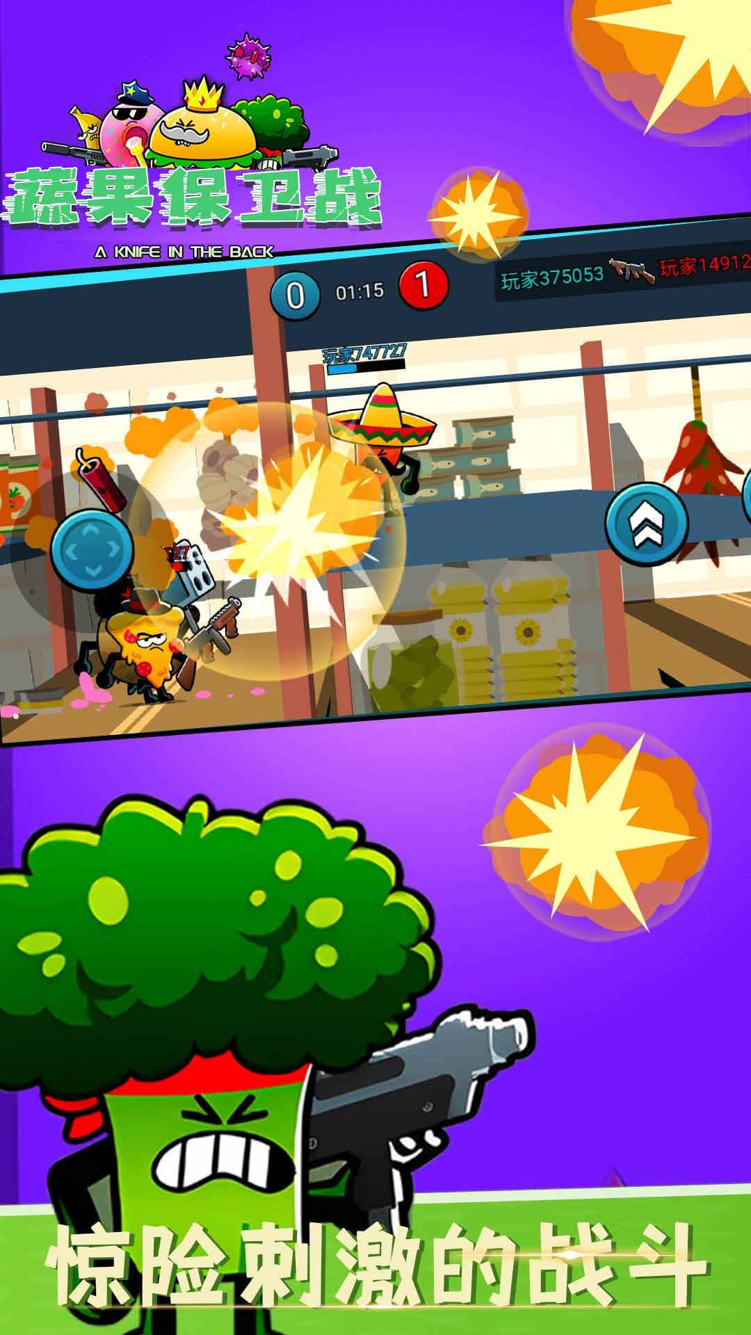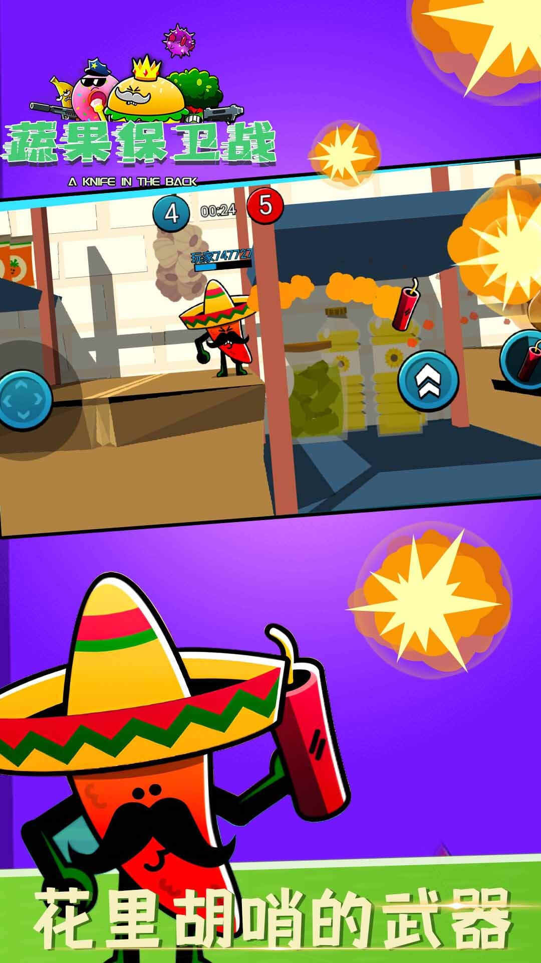 游戏操作也很easy,左手控制人物移动,右手控制人物跳跃和攻击。值得注意的是选择不同的人物有不同的攻击方式,比如花椰菜是开枪,辣椒是炸弹。