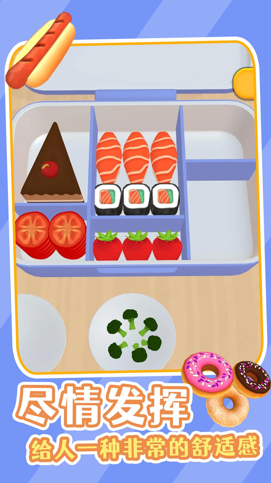 2、美味的便当卡通画面风格,各种食材都相当精致,有着不同精彩的背景音效,有着非常舒适的游玩体验。