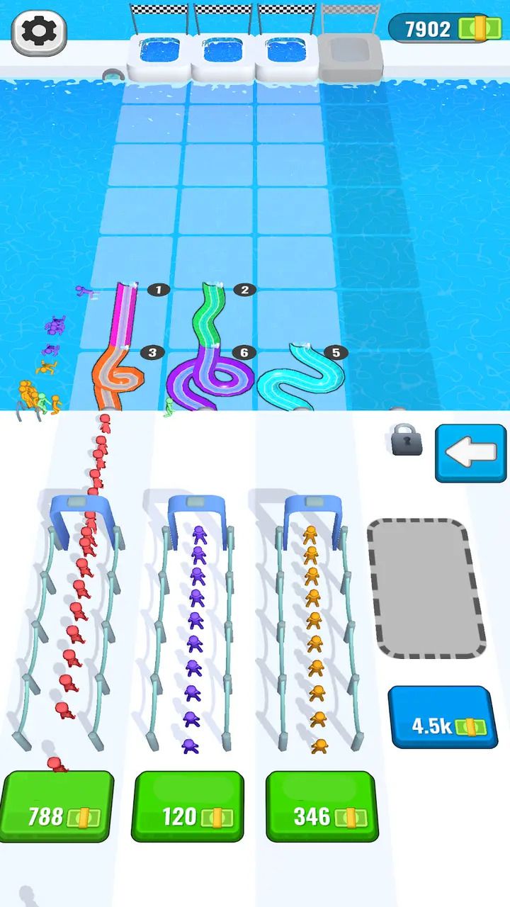 2.创造梦幻水上乐园,通过合并滑滑梯、建造设施等任务,打造独一无二的乐园。