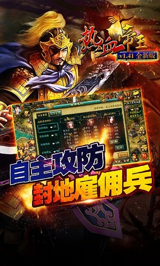 新晋头衔,追逐至高荣耀!告别求贤之渴,俘虏败寇尽皆效忠!重盼所归,热血帝王全新版本强势来袭!披盔戴甲,重燃三国烽烟,日月兼程,再创帝王盛世!独创真实道路系统、唯一名将系统、官职选拔系统。最具硝烟的玩法,抢占资源点、掠夺玩家封地,灭国灭城,更有三大兵种高新科技亮相战场,让你实时体验现场风云变幻!火爆的战争格局引领心跳玩法,擐甲持兵破敌围,千军万马任尔行!是真男儿,就来战!