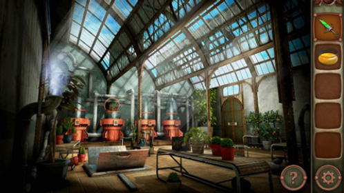点击绿屋的第二个罩子,我们需要将5个颜色的齿轮按钮放到对应颜色的圆圈里,罩子已经打开了,用网兜捕捉一只苍蝇。点击右边的大门,得到橙子,用小刀切成一半。来到之前魔盒的这里,将苍蝇放到捕蝇草上面,用针管获取绿色的液体。点击第三个罩子,将半个橙子放到机器上获得橙汁,橙汁和绿色液体混合在一起!再次点击大门,将酸倒到门上的三个铁柱子上面,铁被腐蚀后门就打开了
