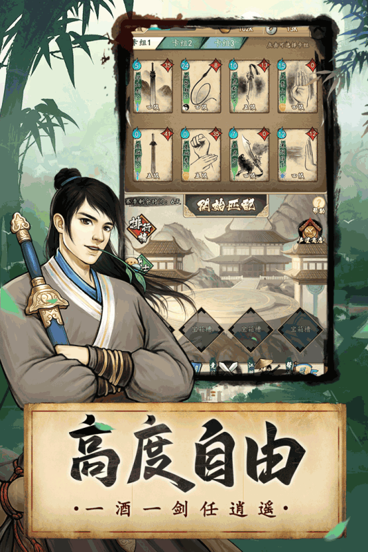 挂出个大侠作为一款国风武侠Roguelite DBG手游,即卡组构建手游,挂出个大侠手游中,在游戏里玩家可以自由探索剧情,收集各种武功,结识各大侠客和NPC,拥有五大职业,上百种武功,近百个侠客,在游戏里玩家可以根据自由搭配侠客和武功,然后过关斩将,成就武林至尊!