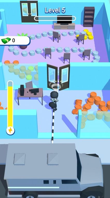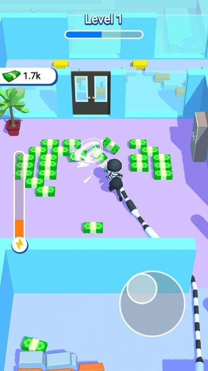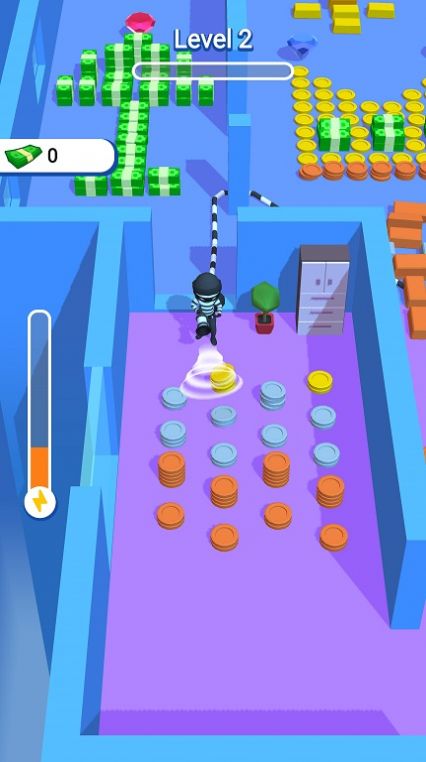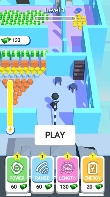1、全新的游戏的主题设置,你需要拿上你的工具,在场景下进行吸钱的操作;
