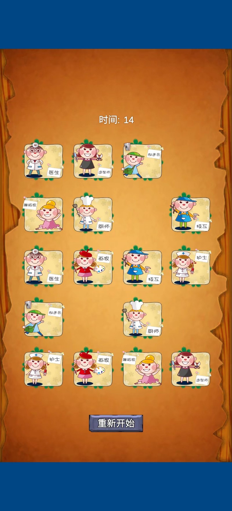 职业对对碰作为一款休闲闯关游戏,在游戏里玩家要点击相同的图标进行消除来获得分数,游戏是有时间限制的,需要消除所有的图片才能闯关成功进入下一关,越到后面难度会越大,赶快来下载吧。