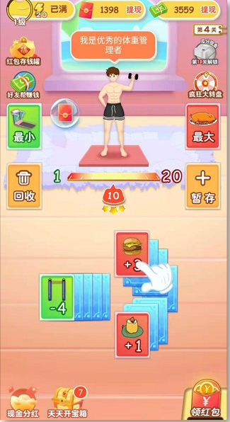 体重消消乐2023红包版,这是最新的体重消除游戏。利用得到卡牌,让体重一直维持中间值才行,不能太胖了,也不能太瘦了,只有这样才能得到红包,轻松的操作一番即可,体重消消乐2023红包版值得你来玩。