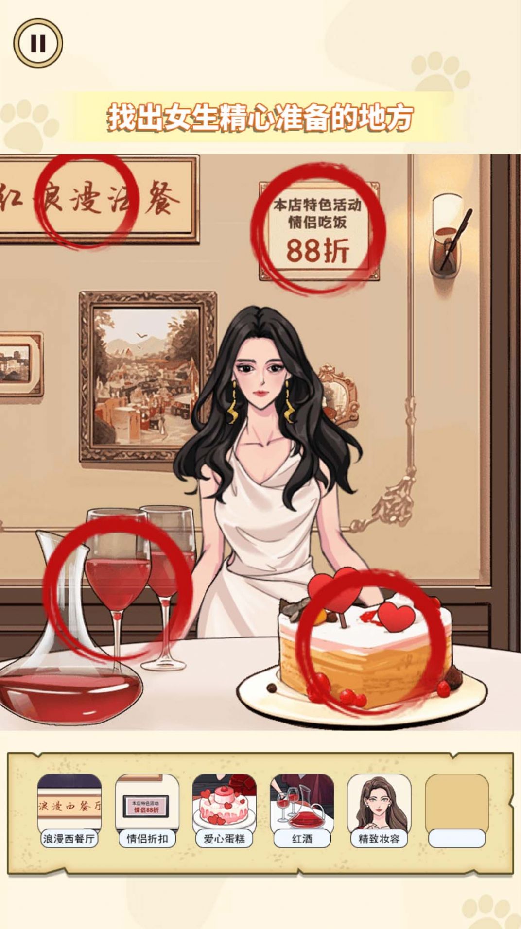 找出出轨证据作为一款休闲有趣的找茬闯关游戏,找出出轨证据游戏有着有趣的找茬方式,有很多道具可以选择,在游戏里玩家要在找出出轨证据帮助情侣找出出轨证据,找出所有合理证据才能过关哦。