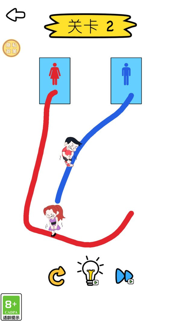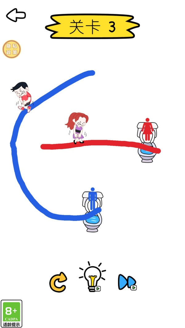 4、用户需要在不同的关卡中,画出一条安全的道路,让主人公能够在避开障碍物的同时顺利到达厕所;