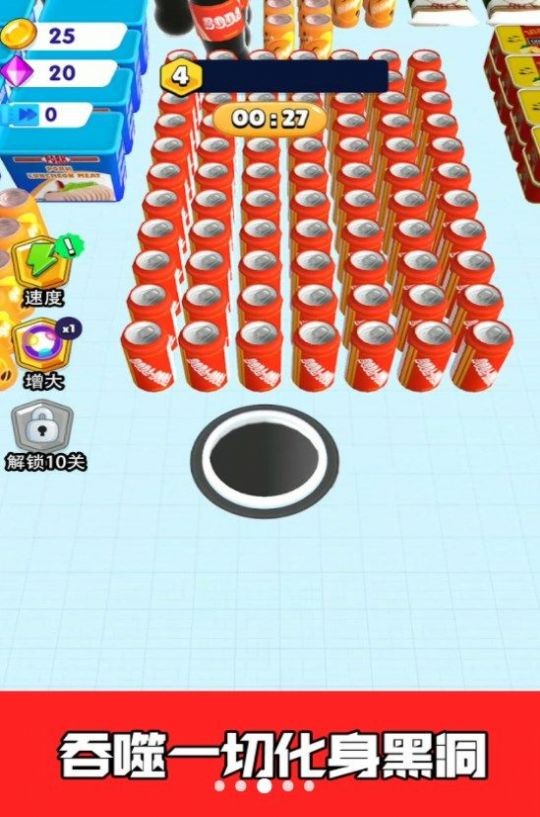 1、让你通过触摸控制黑洞的移动,还能吞噬各种物体。