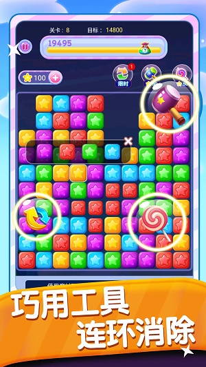 4.当遇到无法消除的星星时,可以利用道具帮助自己连环消除。
